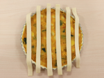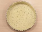 直径18cmのパイ底に合わせて市販のパイシートをめん棒で2~3㎜厚に伸ばします。隅に空気が入らないようにぴったりと押し付けて型に敷き、縁をナイフで切り落とします。※空気穴がされていないパイシートの場合はフォークで穴をあけておきます。
