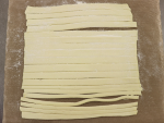 残りの生地を2~3㎜厚に伸ばし、約1㎝幅の細長い生地を12本分カットします。三つ編み用に約6㎜の細長い生地を9本分カットします。※足りない場合は残った生地を合わせて伸ばして使用します。
