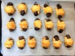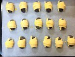 ①の三角形の底辺部分にチョコを2粒置きそのままくるくると巻き、巻き終わりの生地を指で押さえてくっつけます。全部で16個作ります。