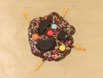 チョコレートが固まる前に、お好みの市販のお菓子をトッピングし、ミックスカラースプレーを散らします。