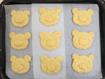生地を9等分(くまちゃんの顔9個分)にします。それら1つずつをくまちゃんの顔(耳、鼻)になるようにパーツを分け、手で丸めて平らにし、くまちゃんの顔を成型します。クッキングシートを敷いた天板に間隔をあけて並べ、同様に全部で9個作ります。