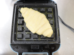 ワッフルメーカーを予熱してサラダ油(分量外)を薄くひき、キッチンペーパーで余分な油をふき取ります。解凍したクロワッサン生地をのせてワッフルメーカーを閉じ、約5分焼きます。(※ワッフル器を使用する場合は両面焼いてください。焼き時間等はお手持ちのワッフル器やワッフルメーカーの取り扱い説明書に従ってください。)