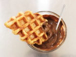③のボウルに②のクロッフルを逆さまにしてチョコをつけます。(または、スプーンでチョコをかけます。)※途中でチョコが固まってきたら再び湯せんにかけてください。