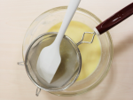 ②に溶き卵、バニラオイル、お好みでラム酒を加え、静かに混ぜ合わせ、生地を裏ごします。
