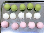 ①を三等分にし、ひとつに溶いた食用色素を加え、もうひとつに抹茶パウダーを加えて色がなじむまで混ぜ合わせたら、それぞれ6等分にして丸めます。