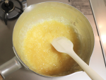 の果肉をブレンダー(またはフードプロセッサーやミキサー)で細かくし、鍋に入れて焦がさないように中火で10分位煮て、きび砂糖、塩を加えてさらに10分位煮ます。途中焦げそうになったら、とっておいたシロップを少しずつ加えます。煮詰まったら、火を止めて、バットに移し冷ましておきます。