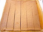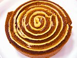 【仕上げ】粗熱がとれたスポンジを幅約5cmに切り、全体にハケでシロップを含ませ、その上からバタークリームをぬります(側面用に少し残しておきます)。クリームを塗った面を内側に、1枚ずつ渦巻き状に巻いていき、巻き終わったら続けて次のスポンジを巻きます。全て巻き終わったら、側面に残しておいたバタークリームを塗り、お好みでアーモンドスライスなどをデコレーションします。