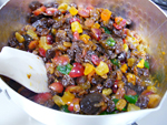 - ドライフルーツ【B】は熱湯にくぐらせ水気を切った後、ドレンチェリーとプルーンは粗く刻みます。フルーツ全部を洋酒(ラム酒・ブランデー)と共に鍋に入れ、全体を混ぜてから中火にかけ、汁気がなくなるまで混ぜながら煮詰めた後、冷ましておきます。