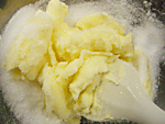 バターとクリームチーズを大きめのボウルに入れ、泡立て器でふわっと空気を含ませるようにクリーム状にしっかりと練り、砂糖と卵を加えて更にすり混ぜます。