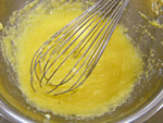 【オレンジ生地と紅茶生地 共に共通】ボウルに室温にもどしたバターを入れ、ゴムベラで練ってクリーム状にします。グラニュー糖を加えて混ぜた後、溶いた卵を加えます。
