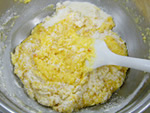 ➀にオレンジ生地にはオレンジピールと粉類【A】を加えて、ゴムベラでさっくりと合わせます。
