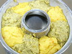 用意をしておいた型に大さじ2ずつ、オレンジ生地と紅茶生地を交互に入れていきます。全て型に生地が入れば、トントンと型を机に落としてから空気を抜き、表面をゴムベラで平らにならします。