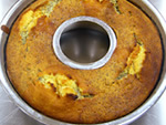 180℃に温めたオーブンで約40分焼き、竹串を刺してぬれた生地がついてこなければ焼きあがりです。