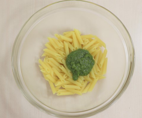 ペンネ(またはパスタ)を商品裏面の記載通りゆでた後、水気を切ってボウルに入れます。