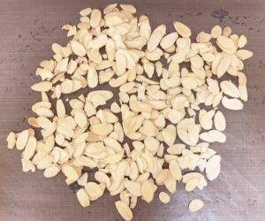 アーモンドスライスは160度のオーブンで5~6分(または、フライパンで薄く色づくまで)ローストし、網の上で冷ましておきます。