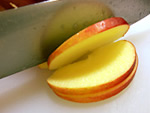 【ポウム】りんごは皮付きのまま4つ割りにして芯を取り、5mm厚にスライスし、塩水につけておきます。