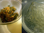 ②をこして液体と茶葉とに分け、茶葉は捨てます。液体をボウルに入れ、グラニュー糖と絞ったゼラチンリーフを加えて溶かした後、ボウルの底を冷水に当てて冷やします。