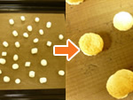 - 飾り用のマシュマロは大きい場合はカットし、オーブン用シートをのせた天板の上に間隔をあけて広げ、250℃に温めたオーブンで約2分表面に焼き色がつくまでローストして冷ましておきます。(※焦げやすいので目を離さないでください。)