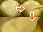 鍋に牛乳を入れて3を少しずつ加えながらダマにならないように木べらで混ぜます。