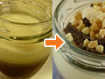 乾いた容器にローストしたアーモンドダイスとキャラメルクランチを均等に入れます。