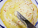 柔らかいバターにオレンジ果汁と粉糖を加えてふわふわとしたクリーム状になるまで2~3分泡立て器ですり混ぜ、クレープの表面全体に薄く伸ばして塗ります。