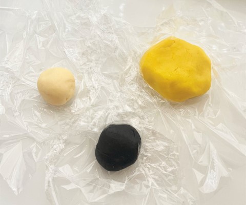 生地のうち15gを2つ取り分け、1つは白生地のままで。もう1つの15gにはブラックココアパウダーと水(2~3滴)を加えて黒生地にします。残った生地(約70g)には、水(1g)で溶かしたクチナシ色素 黄または食用色素 黄を加えて混ぜ、黄色の生地を作ります。白・黒・黄色の3色の生地ができたら、ラップ材で包んで軽く潰し、冷蔵庫で30分寝かせます。