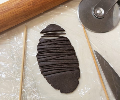 冷蔵庫から生地を出して黒生地を2~3㎜の厚さに平らに伸ばし、ナイフやピザカッターで、1~3㎜幅にランダムにカットし、冷凍庫で凍らせます。これは虎柄模様になります。