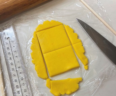黄色生地は5㎜の厚さに平らに伸ばし、縦・横4×5㎝にカットします。これは鬼のパンツの土台になります。