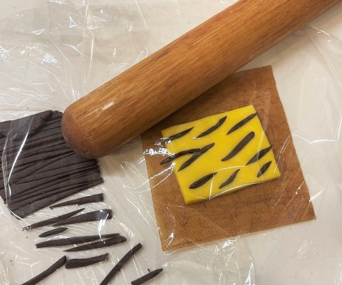 冷凍庫から凍っている黒生地を出し、常温の黄色生地に何本かのせ、押し込んで虎柄を作ります。上からめん棒で軽く転がし、馴染ませます。