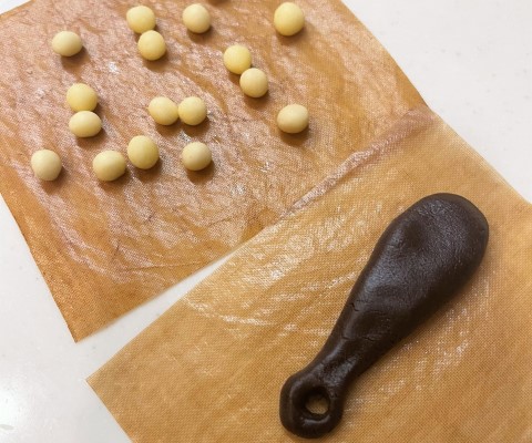 残った黒生地はまとめて棒状にして形を整え、金棒を作ります。細い方をストローで穴を開けると、持ち手部分になります。白生地は直径5㎜程度に小さく丸めて、福豆をたくさん作ります。