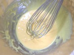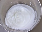 ボウルに卵黄をほぐし、きび砂糖を加えて泡立て器でマヨネーズ状になるまですり混ぜます。別のボウルに卵白を入れてほぐし、ふわふわになるまで泡立て、グラニュー糖を加えてピンとツノが立つまで泡立てます。(メレンゲ)