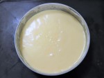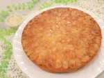 - 敷き紙を敷いた型に湯せんにかけて溶かしたバター20gをハケでぬり、アーモンドスライスを中心から円を描くように貼り付け(余ったスライスは側面や上から崩して散らす)、冷蔵庫で冷やしておきます。