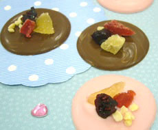 まな板やバットを用意し、その上にラップ材やオーブン用シートを広げ、➀のチョコレートをスプーンで丸くなるようにたらし、乾く前にドライフルーツを乗せて飾り付けます。