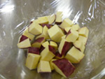 - さつま芋は約1cm角に切り、ラップ材をしてから500wの電子レンジで約2分かけておきます。