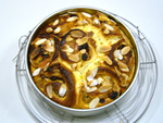 水(分量外)で溶きほぐした卵黄をハケで塗り、上からアーモンドスライスをのせます。型ごと天板にのせて180℃に温めたオーブンで25~30分焼きます。