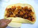 生地を台の上に取り出して麺棒で20×30cmに伸ばします。上部を約3cm残してりんごのフィリングとレーズンを全体に広げ、上から材料【B】をそれぞれ全体に行き渡るようにふりかけます。