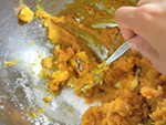 かぼちゃは茹でて皮をとってフォークで押しつぶし、温かいうちに砂糖とバターを加えて混ぜ溶かします。