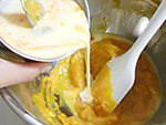 【卵液】を➀に少しずつ加えながらゴムベラで混ぜます。