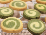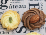 ①の生地を2種類作り、それぞれ3mm厚にめん捧で伸ばします。ココア生地(または抹茶生地)とプレーン生地を重ねあわせ、空気がはいらないようにクルリと巻きます。(重ねる順番はお好みで)ラップ材に包んで冷蔵庫で30分休ませ、5mm厚にカットし、②と同様に同様に焼きます。