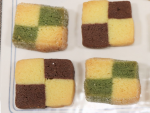 ①の生地を2種類作り、それぞれ3㎝角の棒状にして形を整え、ラップ材に包んで冷凍庫で30分冷やし固めます。それぞれの生地を4等分にし、ココア生地(または抹茶生地)とプレーン生地を交互に並べて棒状に成型し、ラップ材に包んで冷蔵庫で30分休ませます。5mm厚にカットし、②と同様に焼きます。