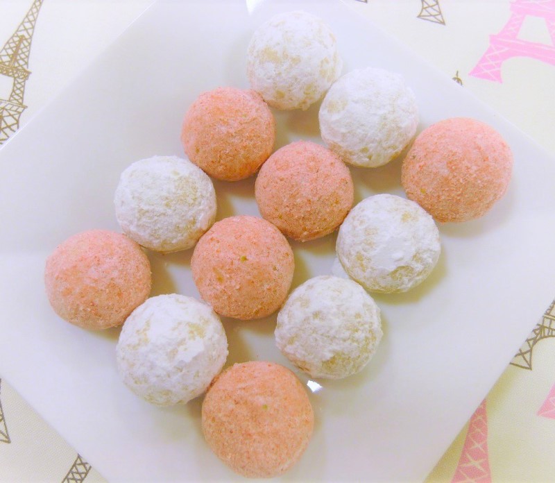 ●お好みでいちごパウダーと粉糖を混ぜてからまぶすとピンク色のスノーボールクッキーに仕上がります。