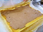 オーブン用シートを敷いたシートスポンジ型(又は天板)に生地を流し入れ、天板に乗せて、天板の下からトントンとたたき生地の空気をぬきます。
