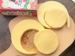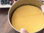 - 底板の抜けるケーキ型(直径12㎝)の大きさに合わせてスポンジケーキを2枚抜いて、1枚だけ底にセットして冷蔵庫に入れて冷やしておきます。もう1枚は、ラップ材をかけておきます。