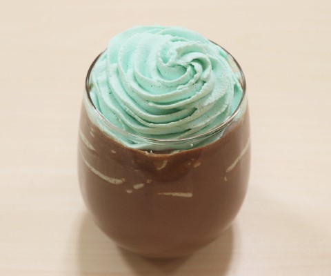 耐熱容器にチョコレート、牛乳50mlを入れて600wの電子レンジで40秒加熱して混ぜます。溶けない場合は10秒ずつ加熱して完全に溶かし、ミントパウダーを加えて混ぜます。