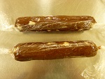【プレーン生地】【ショコラ生地】をそれぞれ2等分にして直径約3.5cmの棒状にのばしてラップ材に包みます(2本分)。約30分冷凍庫で冷やします。 ※焼き上がりは、多少大きくなるので、お好みのサイズより小さめに棒状にしてください。
